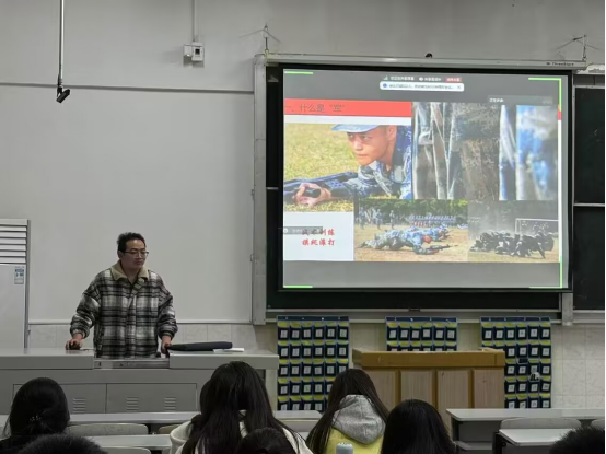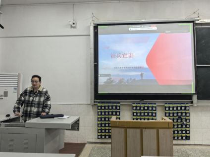 辅导员吴朝晖从征兵条件、征兵方式、征兵流程和优待政策这四大方面展开。他详细地讲解了当前大学生最关注的大学生应征入伍安置政策、学业优待政策、经济补助政策等问题,让大家对于征兵具体事项有全面了解。同时他也强调参军要具备一定的条件,除了身体素质要达到要求之外,在学生政治面貌、家庭背景、品性道德等方面也有相关要求。而后又结合PPT上的图片来展示军旅生活的艰苦与不易,告诫同学们要考虑清楚,不能做逃兵。