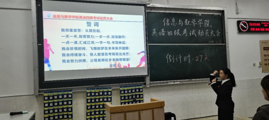 举行英语四级考试动员大会。本次大会旨在为学生提供考前辅导,分享备考经验,进行集体宣誓,激发同学们的学习热情和考试斗志。外国语学院陈琳琳老师、辅导员吴朝晖老师以及一年级高英班全体学生参会。