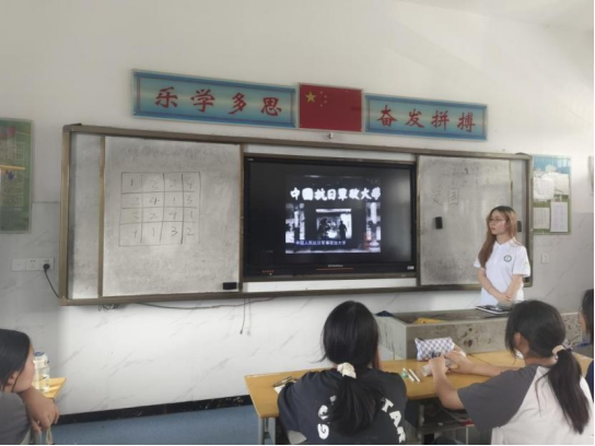 (通讯员 付正东)志愿服务队以传播抗大精神,弘扬红色文化,将爱国和爱党的情感深深植根于学生心中为宗旨,结合孝感市孝昌县当地的抗大分校红色文化,专门开设了中国抗日军政大学红色文化课。7月5日下午,志愿者周芙莹同学以观看视频和红色故事讲解的形式为小悟林中801班的同学介绍了中国抗日军政大学的起源与发展,介绍了抗大精神的内涵,提醒同学们要时刻保持危机意识,始终将爱国放在第一位,最后志愿者与学生共同学习中国抗日军政大学的校歌,并决定将这首充满红色文化气息和爱国主义精神的歌曲作为班歌。