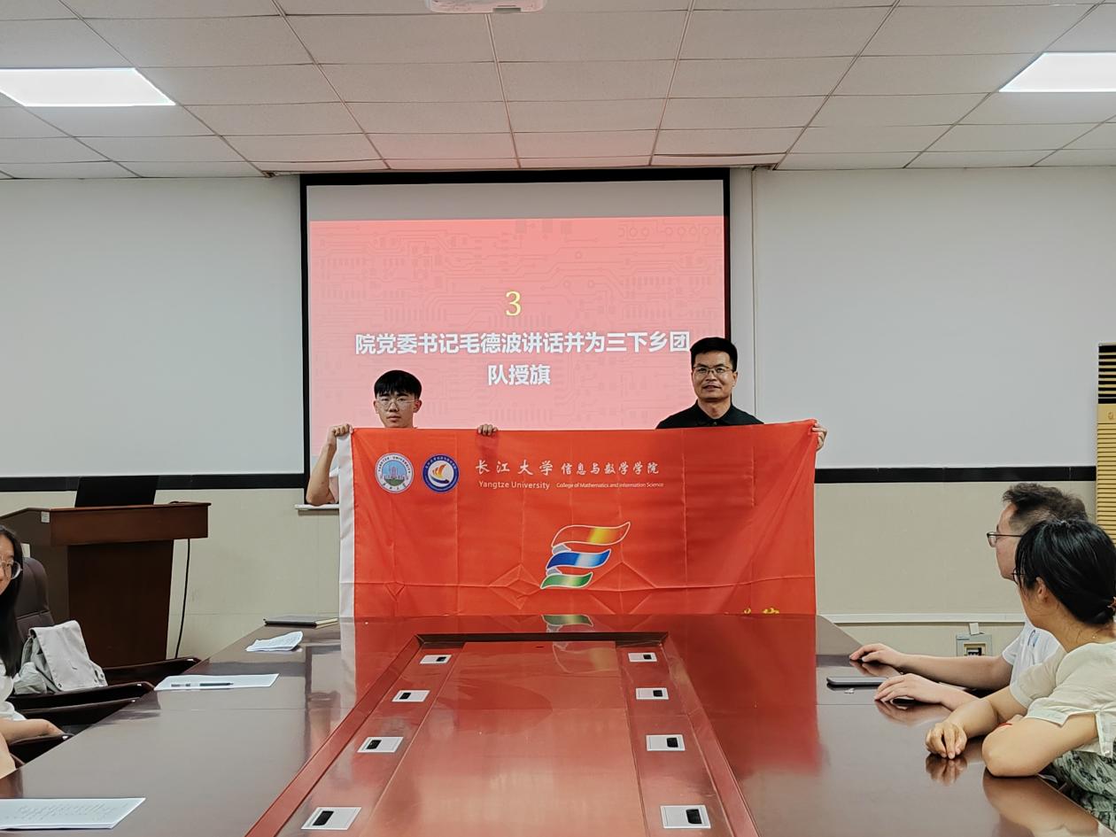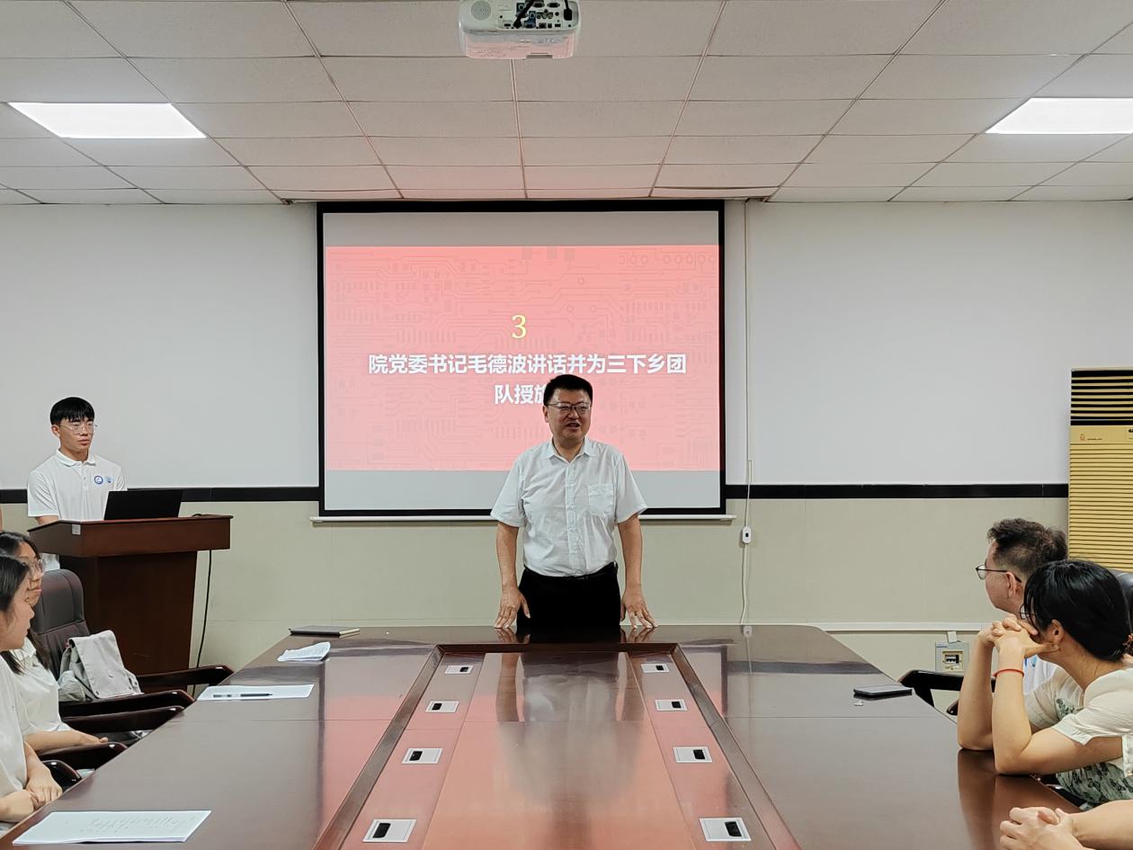 院党委书记毛德波发表讲话。他深刻阐述了暑期社会实践的重要意义,鼓励同学们将专业知识与实践相结合,在服务社会的过程中传播先进文化,不断提升综合素养。讲话结束后,毛德波书记亲自为“三下乡”团队授旗,鲜艳的旗帜在会场中格外醒目,象征着沉甸甸的责任与光荣的使命,接过旗帜的瞬间,队员们心中的使命感油然而生。