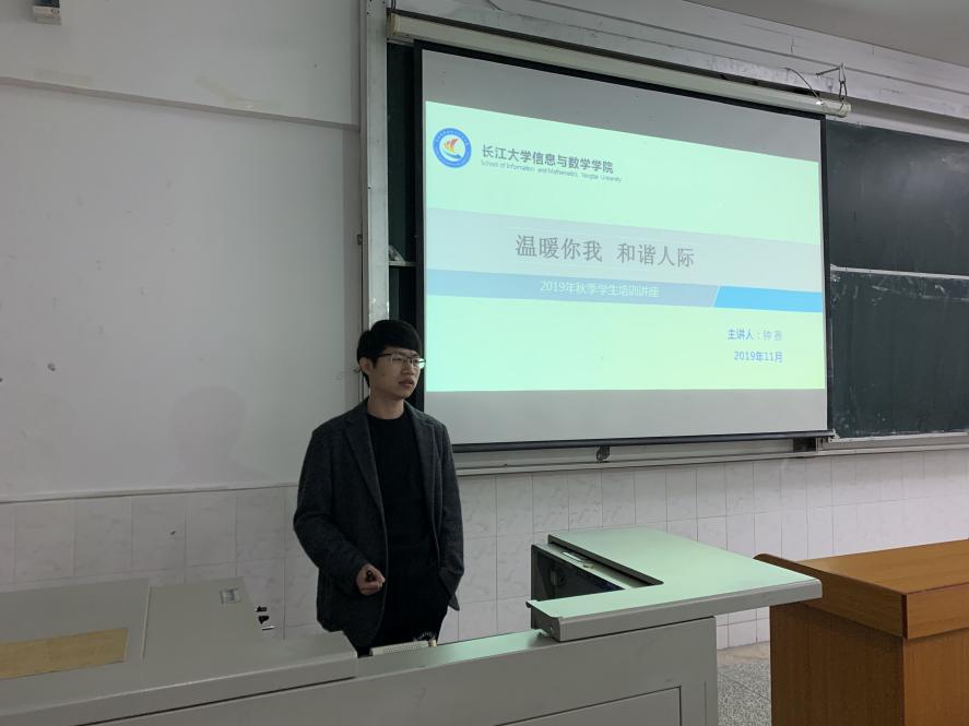 钟赛老师以“温暖你我,和谐人际”为主题,就大学生人际交往的困惑、常见的心理危机、人际交往的技巧、心理健康中心的相关简介、学生干部的必备技能五个方面展开讲解。钟赛老师以寝室关系为例,为同学们讲述营造良好宿舍关系的重要性,宿舍是同学们的第二个家,良好的宿舍关系可以促进宿舍成员和谐相处,甚至可以促进宿舍成员共同学习、进步,逐渐变为更优秀的大学生。紧接着,他就大学生常见的心理危机与同学们展开交流,他提到有的学生缺乏在公众场合表达自己、与他人交往的能力和勇气,有的学生由于个体间的正常交往不够,又易引发猜疑、嫉妒等,极不利于学生的健康成长。钟老师鼓励学生干部多帮助身边存在类似心理危机的同学,使得同学们都可以学会平等交往、尊重他人、真诚待人、互助互利、讲究信用等大学生人际交往技巧。最后,钟赛老师提到,作为学生干部更应该培养健康良好的心理素质以及社交能力,学生干部应当努力提升自我能力,争取做到学习工作双丰收。