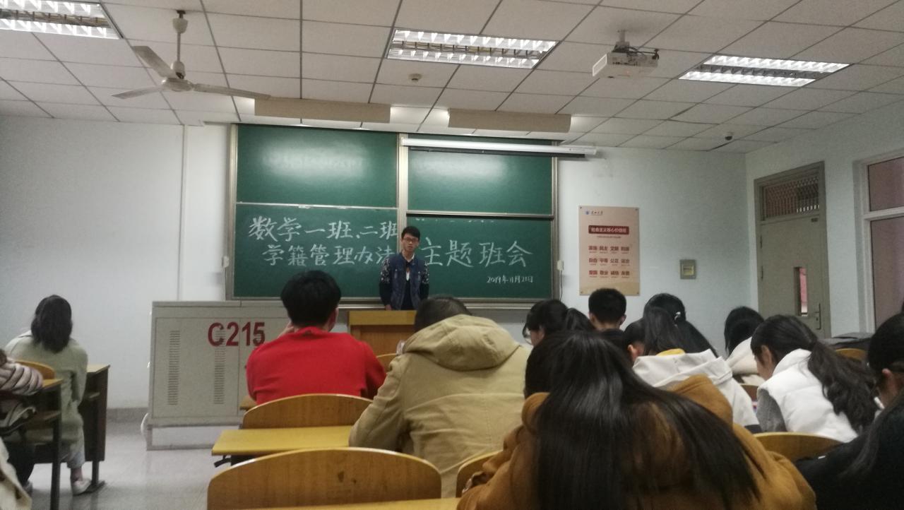 普通本科生学籍管理办法》,促使每位学生全面了解《学籍管理办法》内容, 11月18日至11月25日,信息与数学学院组织2018级、2019级本科生团支部陆续开展主题班团会,学习我校学籍管理规定和相关政策。