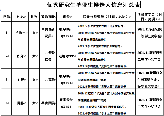 根据学校《关于开展2022届优秀研究生毕业生评选工作的通知》要求,亚洲无码 认真组织开展了2022届优秀研究生毕业生评选工作,经个人申请、班级推荐、学院审议,讨论决定拟向学校推荐优秀研究生毕业生4名,现予以公示。