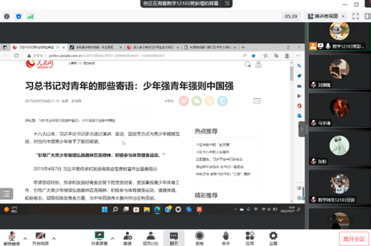 此次会议从“习近平论青少年成长”“习近平生态文明思想”“习近平的教师情”“学宪法 讲宪法”这四个方面开讲。首先同学们一同学习了习近平总书记对青少年的殷切寄托,深刻意识到青少年的重要地位,少年强青年强则中国强。接下来同学们一起了解习近平总书记对保护环境层面的思想,了解到现在对于环境治理有很大的优势,提高同学们对保护环境的自信心、责任感和自觉性。然后同学们一同观看《习近平的教师情》这段视频,感受到教师的辛苦和习近平总书记的亲切慰问。再然后学习宪法相关知识历史不断进步,时代不断发展,法治建设只有跟上时代的脚步,才能发挥引领和社会进步的作用。广大党员干部要以修改宪法为契机,增强法治意识,强化法治观念,遵守宪法法律,为实现中华民族伟大复兴凝聚人心,汇聚力量。会议最后,同学们学习到作为新时代的接班人我们要肩负起历史使命,抱有远大理想、努力提高自身素养、调整好自己的心态、摆正好自己的位置、要有能吃苦耐劳的精神、有责任感、并且树立终身学习的观念,通过不断的学习来适应社会,坚定战略自信,保持战略清醒,增强信心斗志,以实际行动迎接党的二十大胜利召开,并且高举中国特色社会主义伟大旗帜,奋力谱写全面建设社会主义现代化国家崭新的篇章。