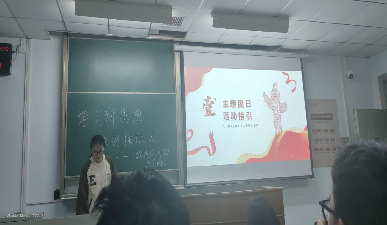 (通讯员 熊语诗)为深入学习宣传贯彻党的二十大精神及团十九大精神,根据团中央关于面向广大团员和青年开展学习贯彻习近平新时代中国特色社会主义思想主题教育的部署安排和《共青团中央关于面向广大团员和青年开展学习贯彻习近平新时代中国特色社会主义思想主题教育的通知》。数据12201班围绕“学习新思想,做好接班人”的主题,于2024年4月7日开展了线下团会活动,本次会议由团支书熊语诗主持,组宣委员组织开展,全班同学共同参与学习