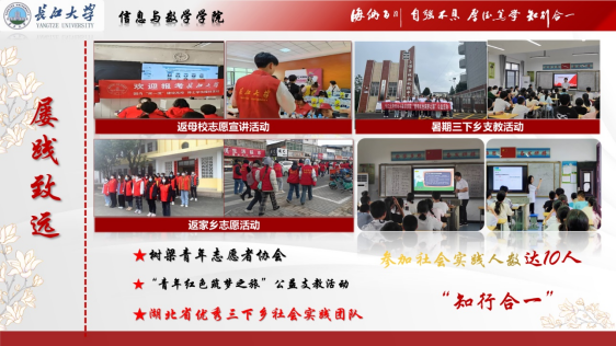 青总队主席、团委学生会科创部部长、组织部部长等,积极参与学校的各项管理和服务工作。在志愿服务方面,全员参与,累计服务时长超过600小时,涵盖图书整理、创文值守、会议志愿服务、文明校园清扫等活动。此外,支部还积极组织返母校志愿宣讲、返家乡志愿活动和暑期三下乡支教活动,其中暑期三下乡支教团队荣获湖北省优秀三下乡社会实践团队,以实际行动践行“知行合一”的理念,展现出强烈的社会责任感。