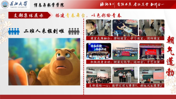 的一个充满活力与进取精神的集体,共有团员28人。该支部思想引领成效显著,严格落实“三会两制一课”,入党积极分子众多。学习成绩突出,年度平均绩点3.32、四级通过率100%,全院排名第一,多人获得奖学金。在学习创新方面,积极参与大创项目,在多项学科竞赛中获奖。组织运行高效,班团一体化建设有机融合。宣传展示形式多样,积极推广支部活动。在各类活动中表现出色,荣获2023-2024数学定理大赛第一名、班级风采展第二名等荣誉,还获评湖北省优秀三下乡社会实践团队,是一个全面发展、成绩优异的团支部。
