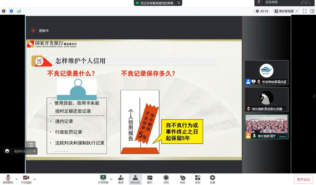 会上,学习了湖北省教育厅专家介绍的还款操作,毕业须知与申请指南三个方面内容,同时对征信知识进行了普及,让毕业生们意识到个人信用记录的重要性。此外还对生源地贷款的办理流程、还款政策及相关机制约束与违约责任进行了深入浅出地讲解,明确了助学贷款的贷款期限、还款利息、偿还方式、提前还款、补偿代偿、逾期还款等相关知识,并提醒同学们务必对个人信用以及助学贷款的后续工作予以高度重视,防止因为个人的粗心大意产生不良信用记录。接着专家就毕业还款方面列出了四项须知从各个毕业生可能遇到的毕业问题,例如如何在网上确认毕业资格,两个密码管理等进行了详细的说明。