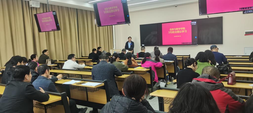 在16教A106开展3月教职工政治理论学习暨支部主题党日活动。院党委书记李喜成主持学习活动,院领导班子成员及全体教职工参加会议。本次政治理论学习包括跟进学习习近平总书记重要讲话和重要指示批示精神、两会”专题、主题教育、师德师风、法治和网络建设五个专题。