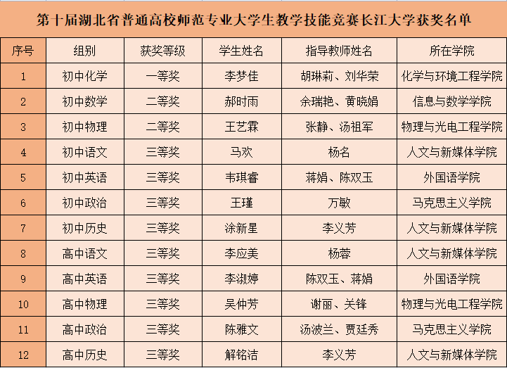 据了解,湖北省普通高校师范专业大学生教学技能竞赛是湖北省师范类学科竞赛中级别最高的竞赛。本次竞赛全省有17所高校的221名选手进入决赛,我校获得的奖项数量位居全省高校第2名,且是获得优秀组织奖的4所高校之一。