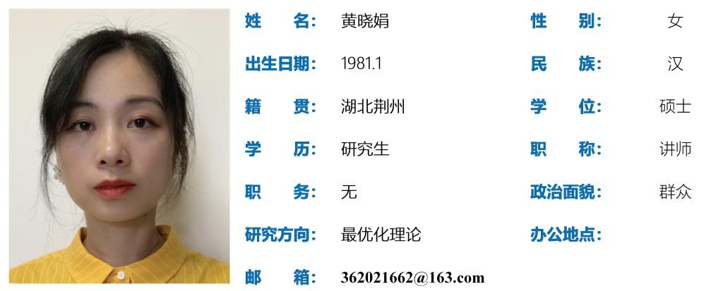 黄晓娟,女,生于1981年1月,硕士,讲师,主要研究生方向为最优化理论,获亚洲无码 青年教师讲课比赛一等奖1项,三等奖1项,发表学术论文8篇,指导湖北省高校师范专业教学技能大赛获一等奖3项、二等奖2项。